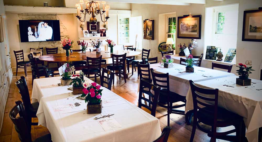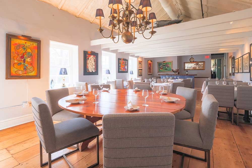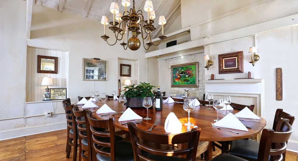 Upstairs, the 1742 Room is a completely private, intimate space that boasts vaulted ceilings, random-width pumpkin pine flooring, and a handcrafted farm table made from reclaimed wood. An ideal venue for business functions, birthdays, wine dinners, holidays, and showers. Please note, the use of stairs is required to access this space. The maximum occupancy in this space is 30 people for a sit-down event.