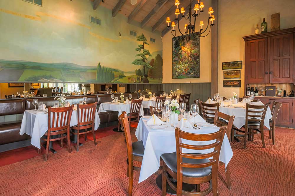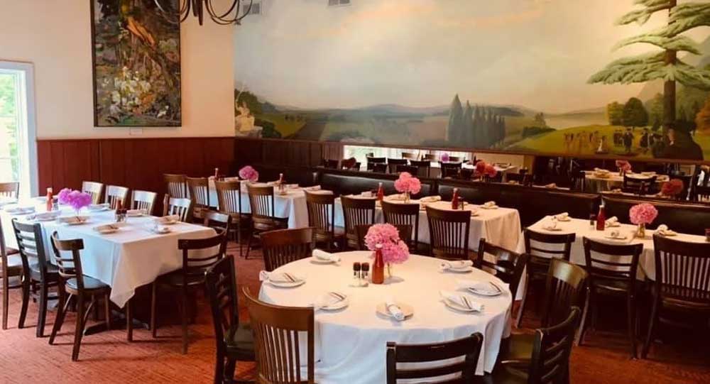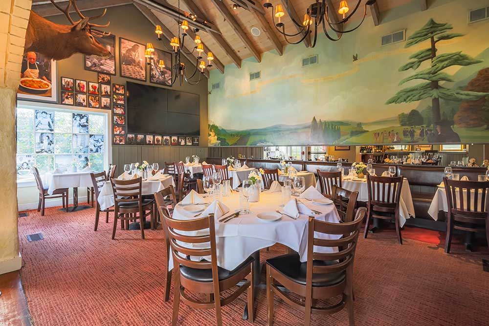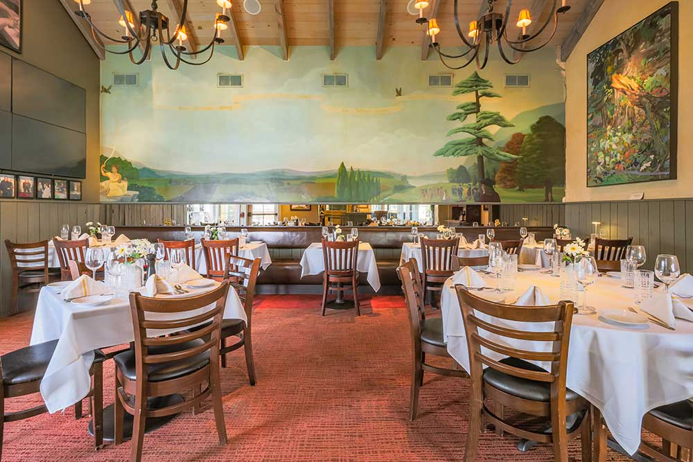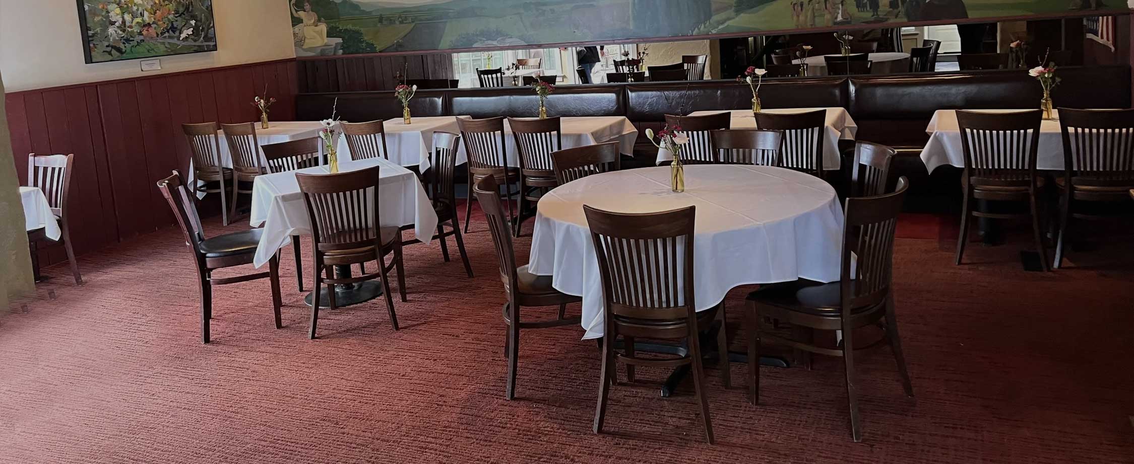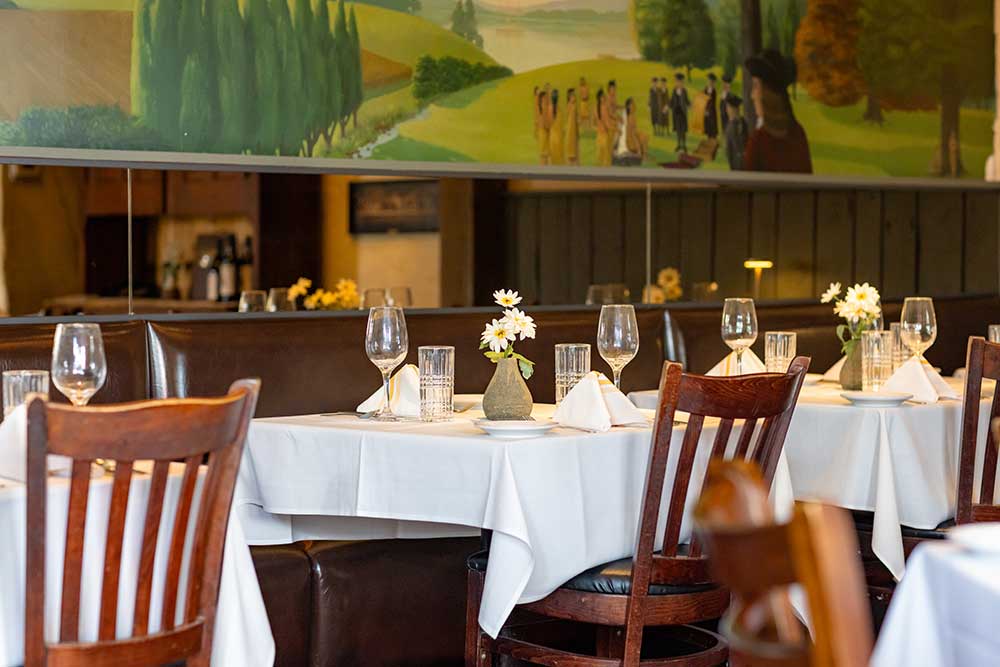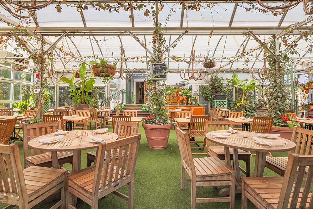 Our downstairs back dining room, artfully designed by famed Broadway set designer, Jim Hamilton is our second largest space, located right off our back bar area. Featuring a stunning mural by Illia Barger along the back wall and beautiful windows that overlook the Garden Greenhouse, this space is perfect for funeral luncheons, birthday parties, business functions, and holiday parties. The maximum occupancy in this room is 40 people.